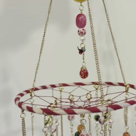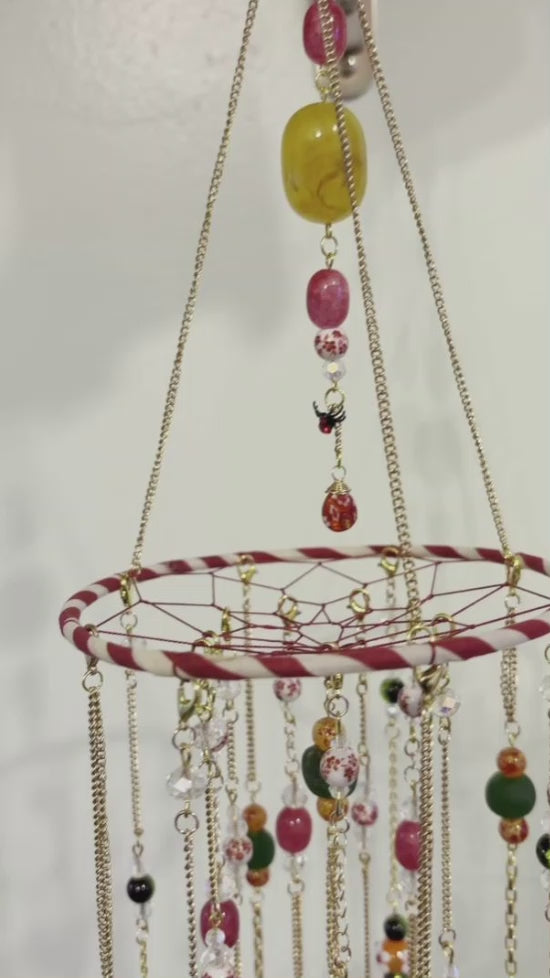Designed as both visual art and architectural accent, Citrus Grove features cascading gold-tone chains adorned with a carefully curated mix of rescued, upcycled, and artisan-made components. Each element is intentionally placed to create movement, balance, and depth—allowing sunlight to activate the piece throughout the day.