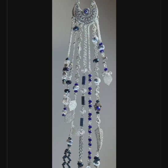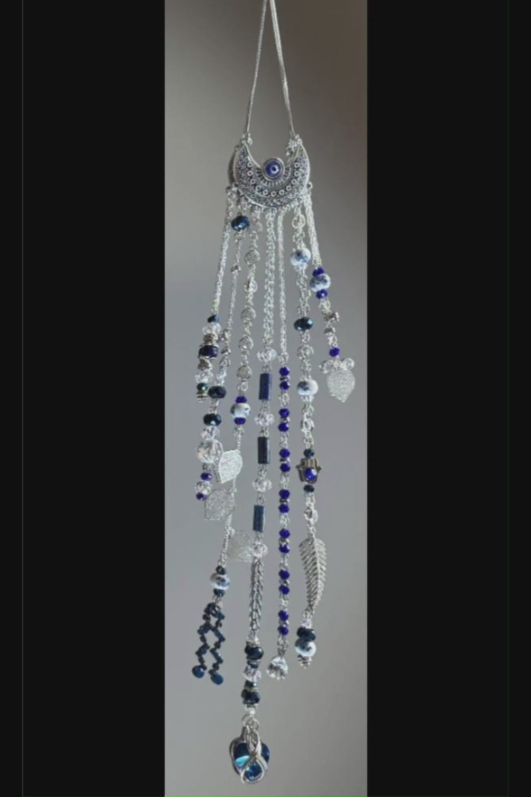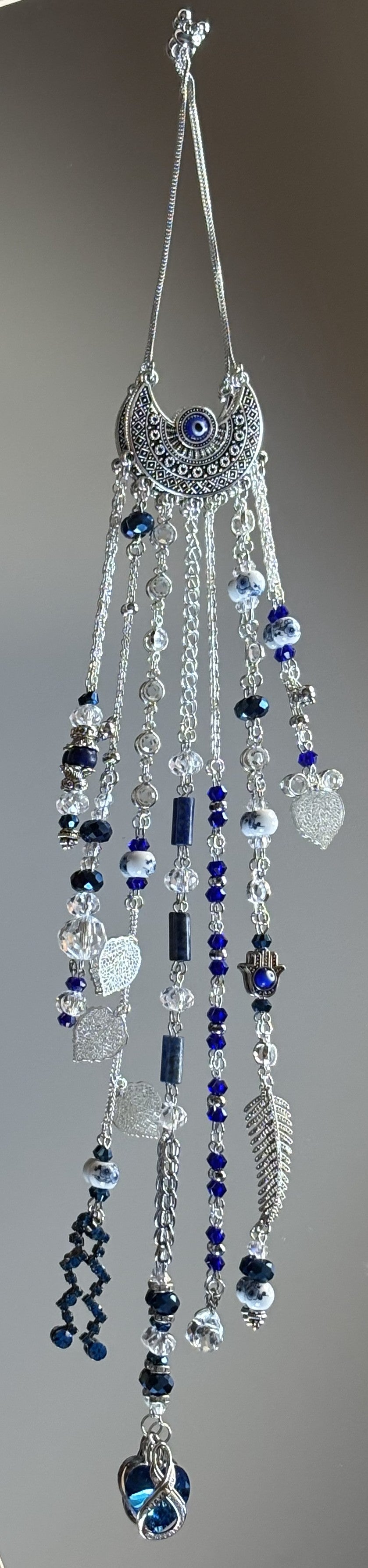 This one-of-a-kind suncatcher is built as a visual talisman—layered with evil eye symbolism, lapis lazuli, and hand-selected blue and clear glass chosen to refract light while quietly standing guard. Every strand moves independently, creating depth, motion, and a presence that changes throughout the day.