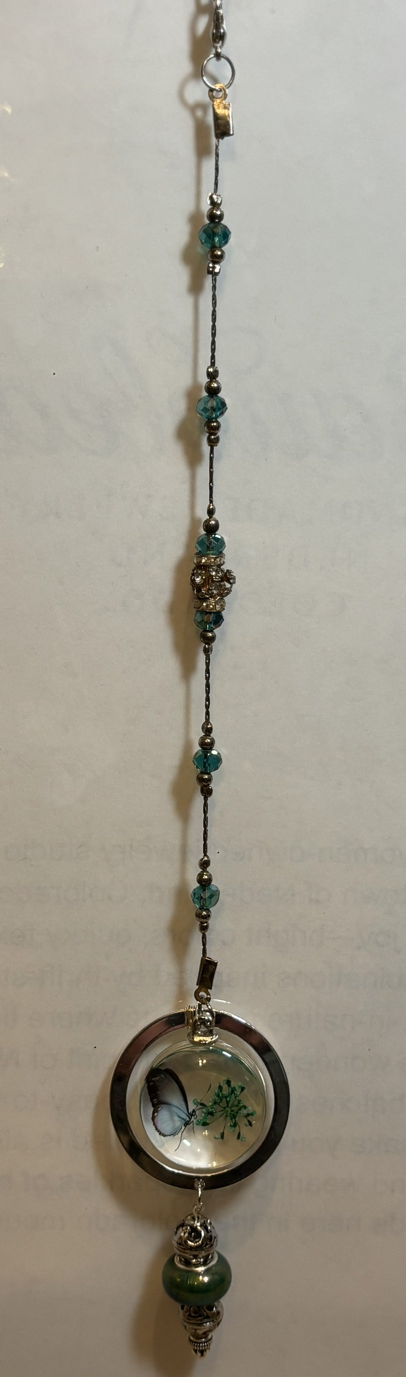 The single vertical strand allows light to travel cleanly through the piece, highlighting the butterfly as a symbol of transformation, renewal, and quiet resilience. Coordinated beadwork above and below adds balance and gentle motion, while the color palette of each strand gives it its own emotional tone.