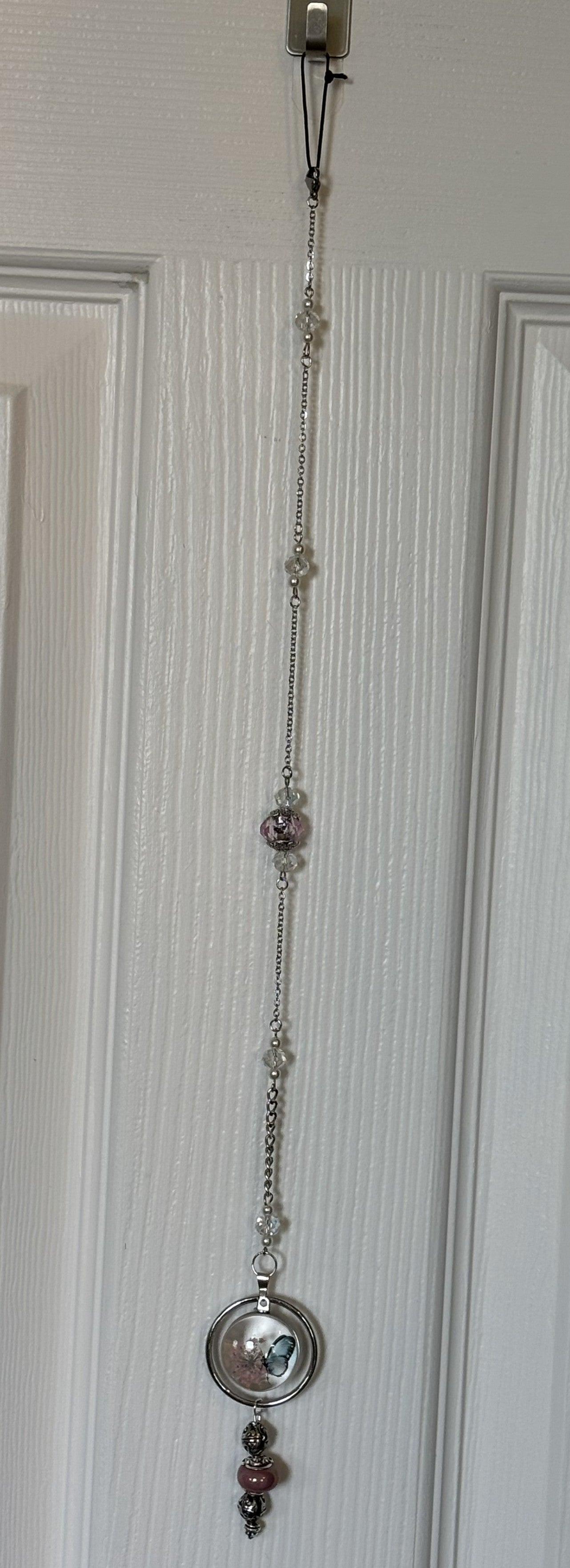 The single vertical strand allows light to travel cleanly through the piece, highlighting the butterfly as a symbol of transformation, renewal, and quiet resilience. Coordinated beadwork above and below adds balance and gentle motion, while the color palette of each strand gives it its own emotional tone.