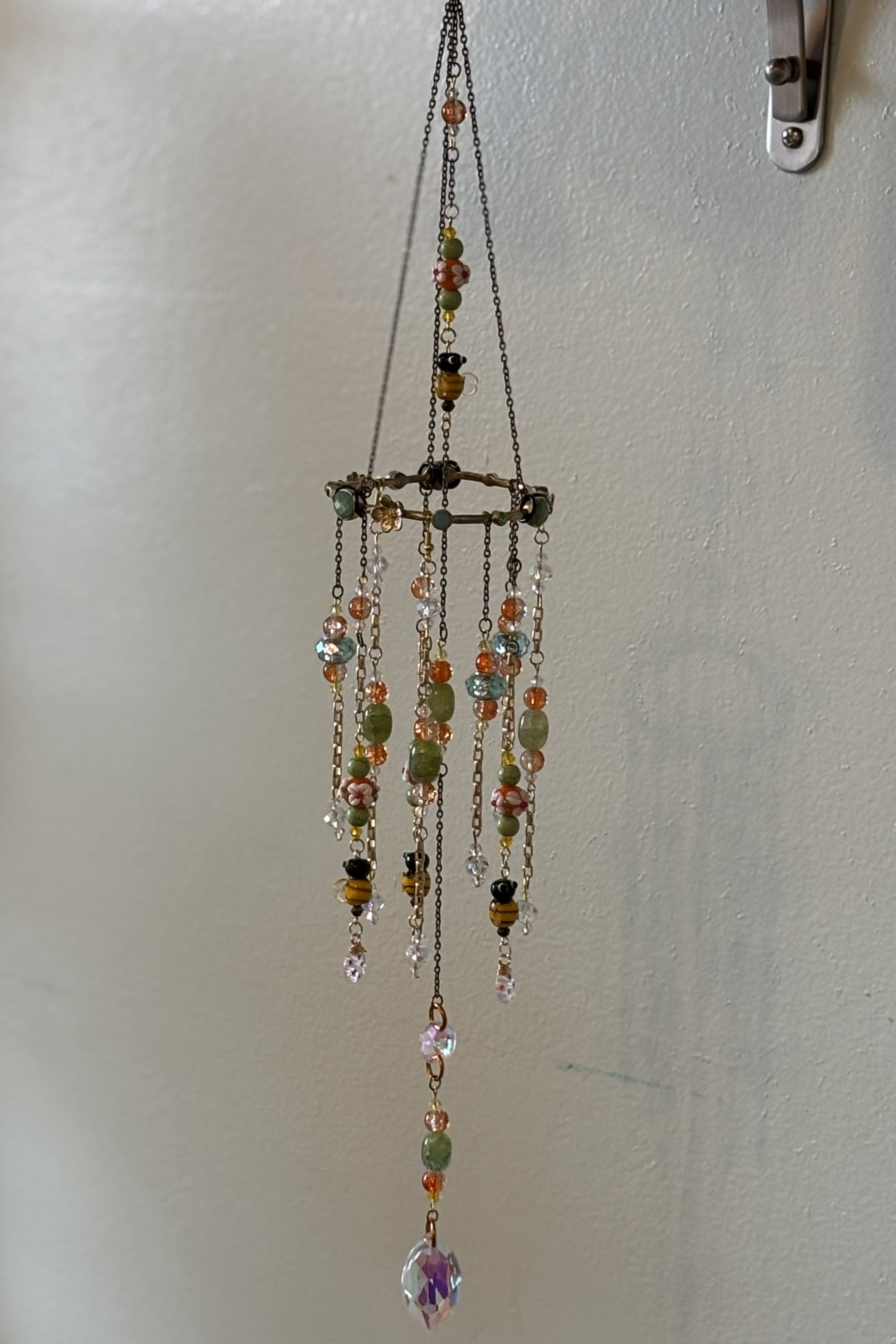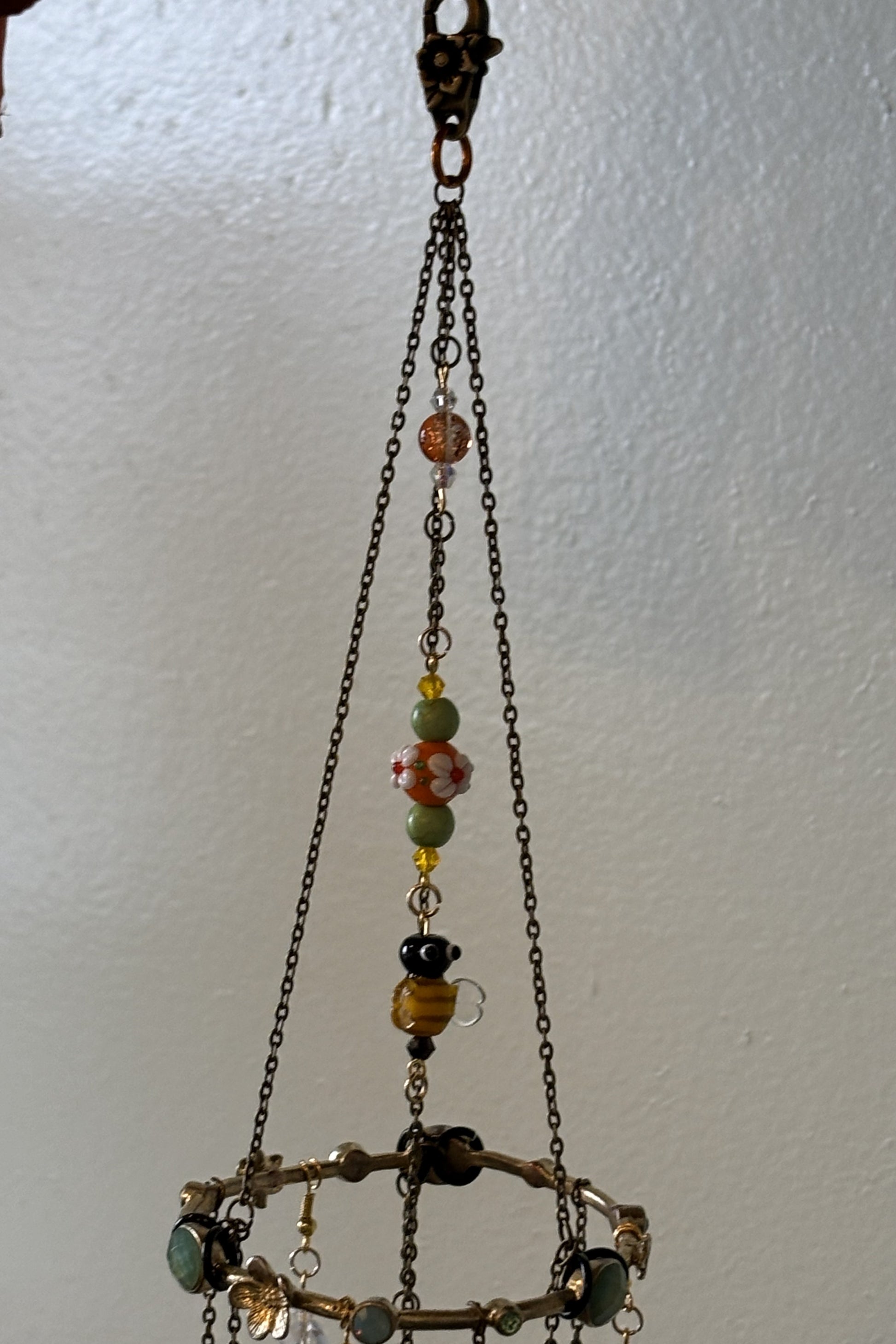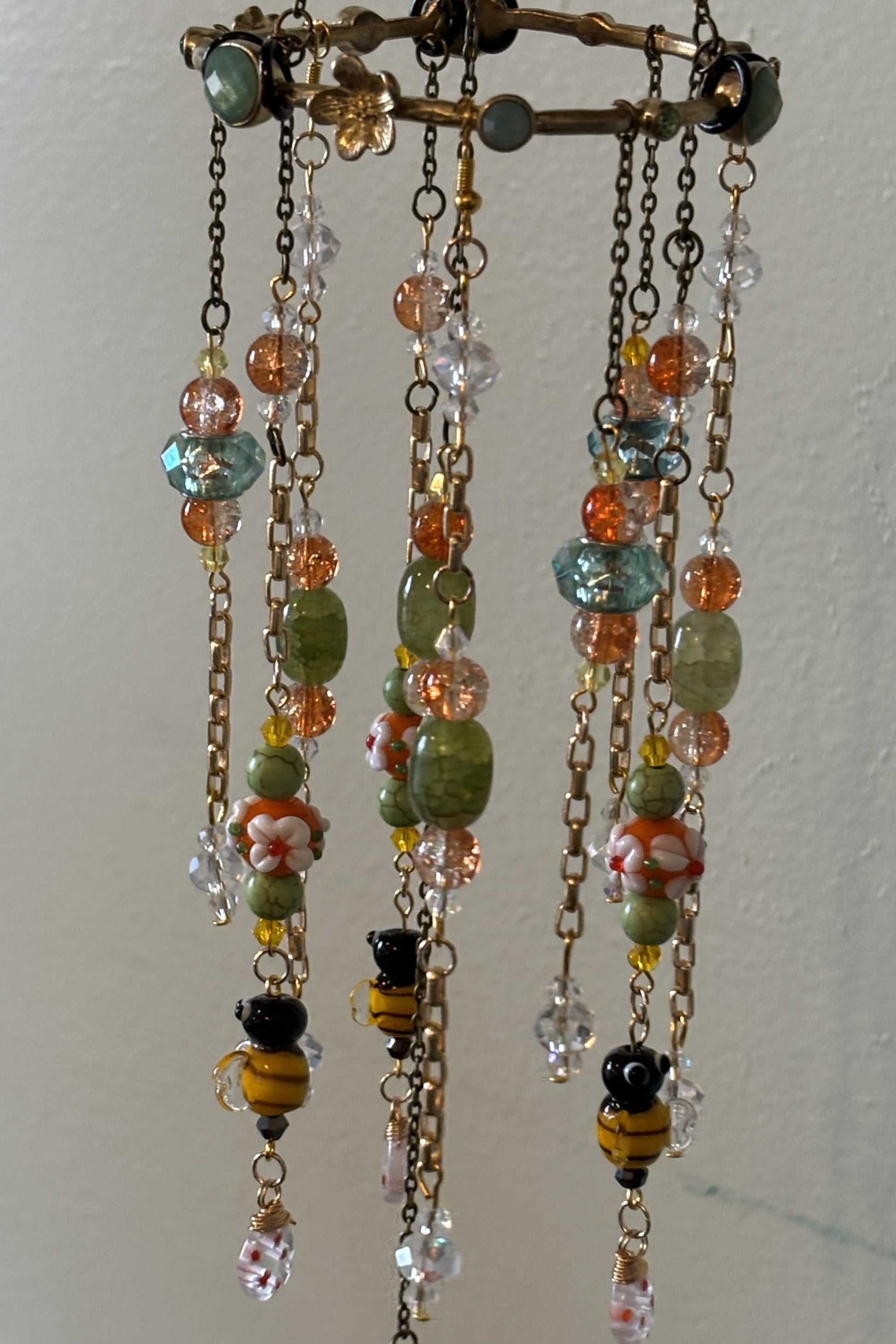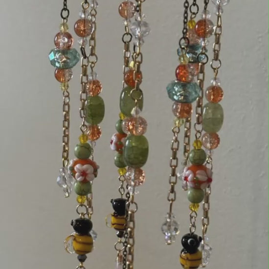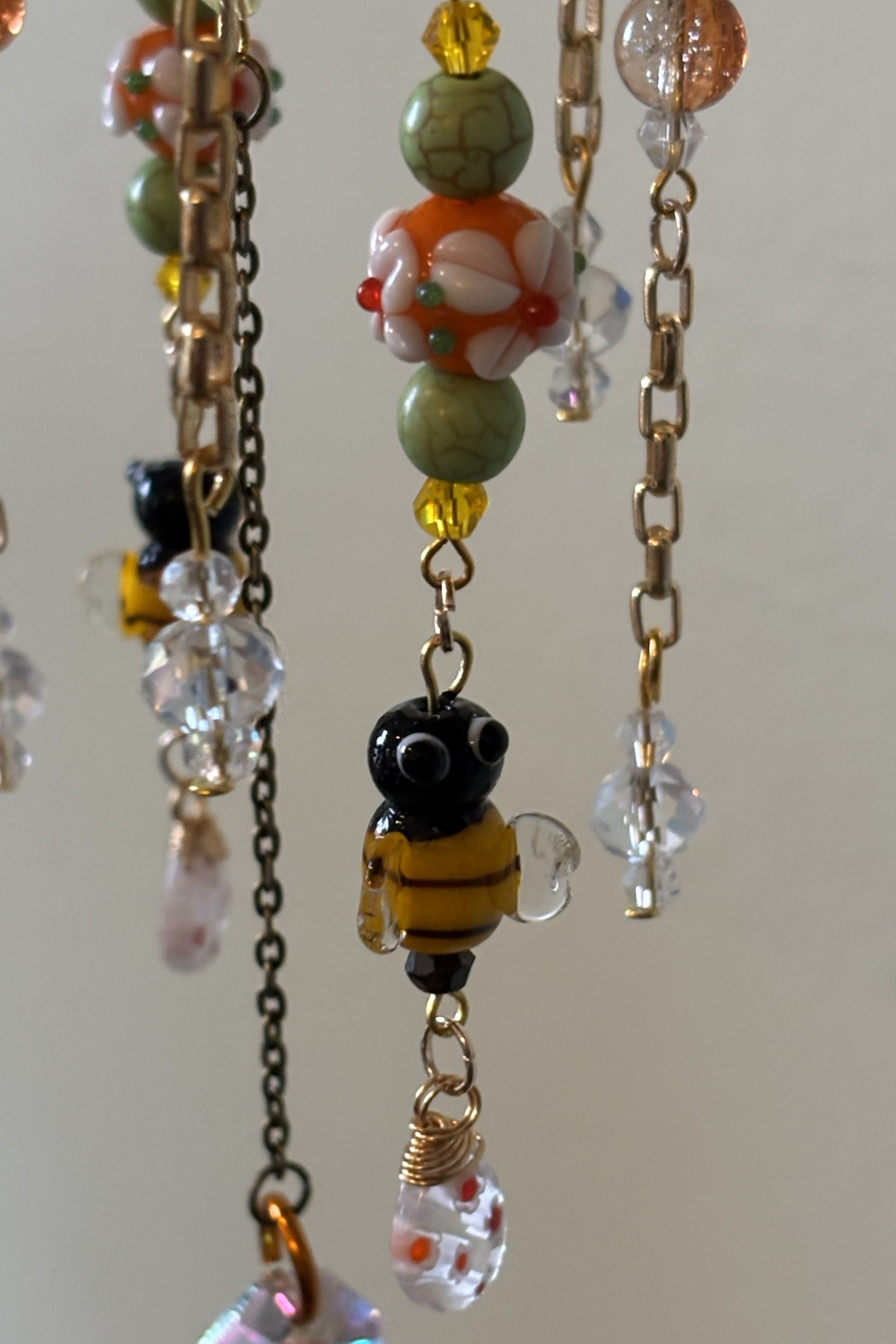 Cascading strands form a miniature garden in motion—layered with glass bee beads, orange glass flowers, green stone accents, crystal-clear light catchers, and sunny yellow highlights. A floral metal bracelet element anchors the design, while varied strand lengths and textures create depth, movement, and sparkle as light passes through.
