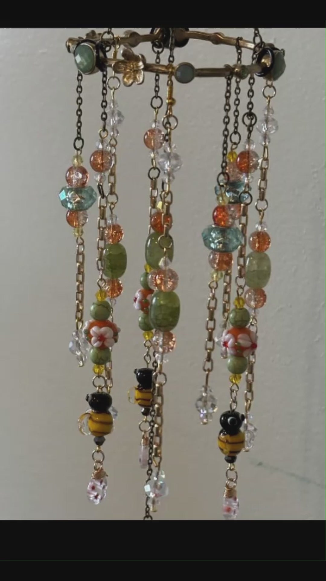 - Materials include: glass bee beads, glass flower beads, crystal glass pendants, green stone beads, resin beads, chain, floral metal elements, and mixed findings